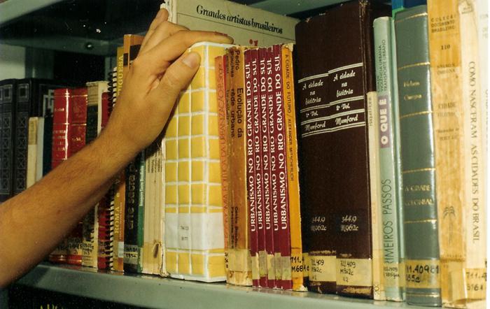 Inserção de objetos não classificados no acervo de livros da Biblioteca Municipal Josué Guimarães através de processos de catalogação colaborativos. Após a primeira inserção na Biblioteca Pública Municipal Josué Guimarães (Porto Alegre), em 2005, realizada em colaboração com a bibliotecária Simone Tarasconi, atualmente os objetos se encontram em processo de re-catalogação, acompanhando a migração do catálogo biblioteca do formato analógico para o formato digital. Esta segunda versão da inserção está sendo realizada em colaboração com a bibliotecária Renata Borges.
