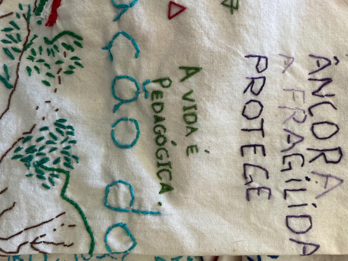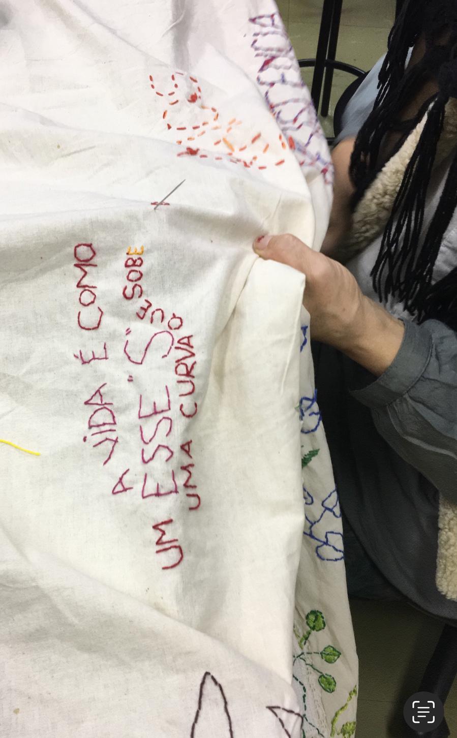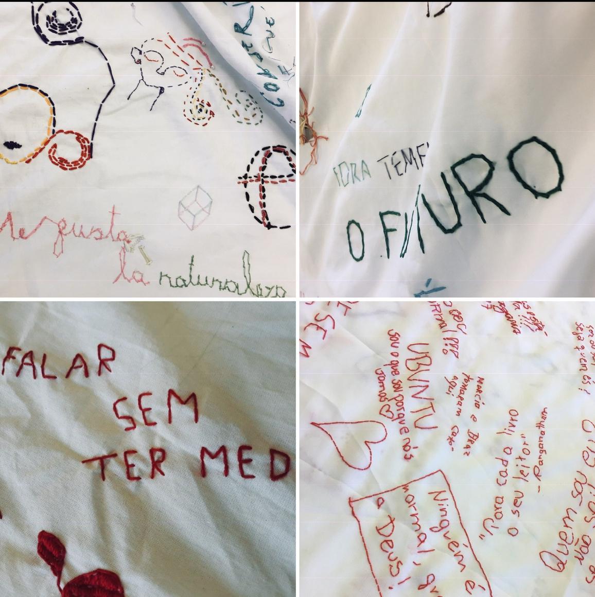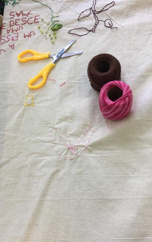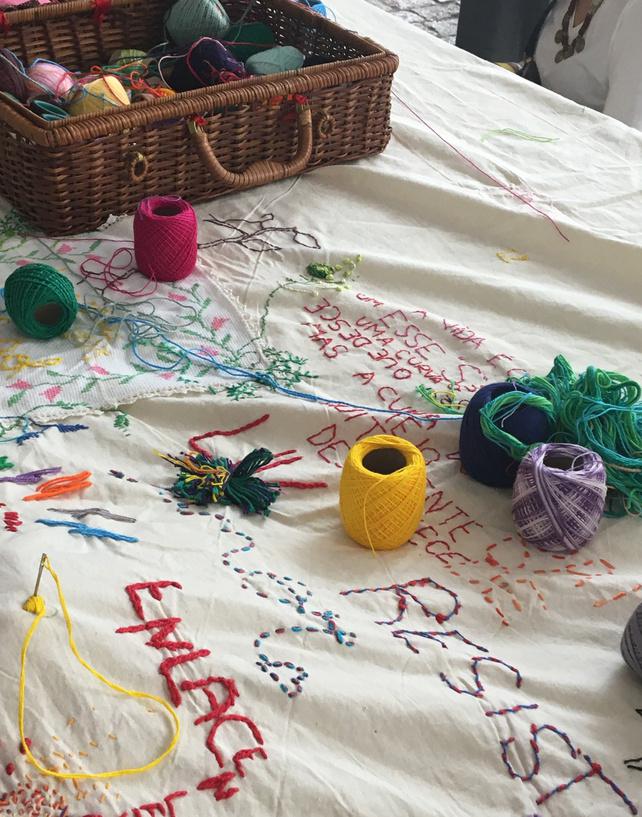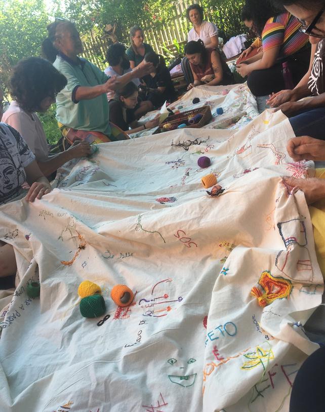 – No coração da agulha é um espaço de cultivo de relações de disponibilidade, confiança e empatia, onde nutrimos atitudes de respeito e acolhimento à diversidade de vozes e modos de existir que compõem o tecido social. No coração da agulha propõe o bordado como prática coletiva. A dimensão coletivizante deste trabalho se materializa nos grandes panos comuns que servem de suporte às rodas de bordado. Os panos bordados assim, livremente e à muitas mãos, atuam como superfícies de contato e inscrição de fragmentos de fala que reúnem conversas inacabadas, memórias, reflexões, perguntas, sonhos, desejos, angústias que nos conectam e representam, como corpo coletivo.