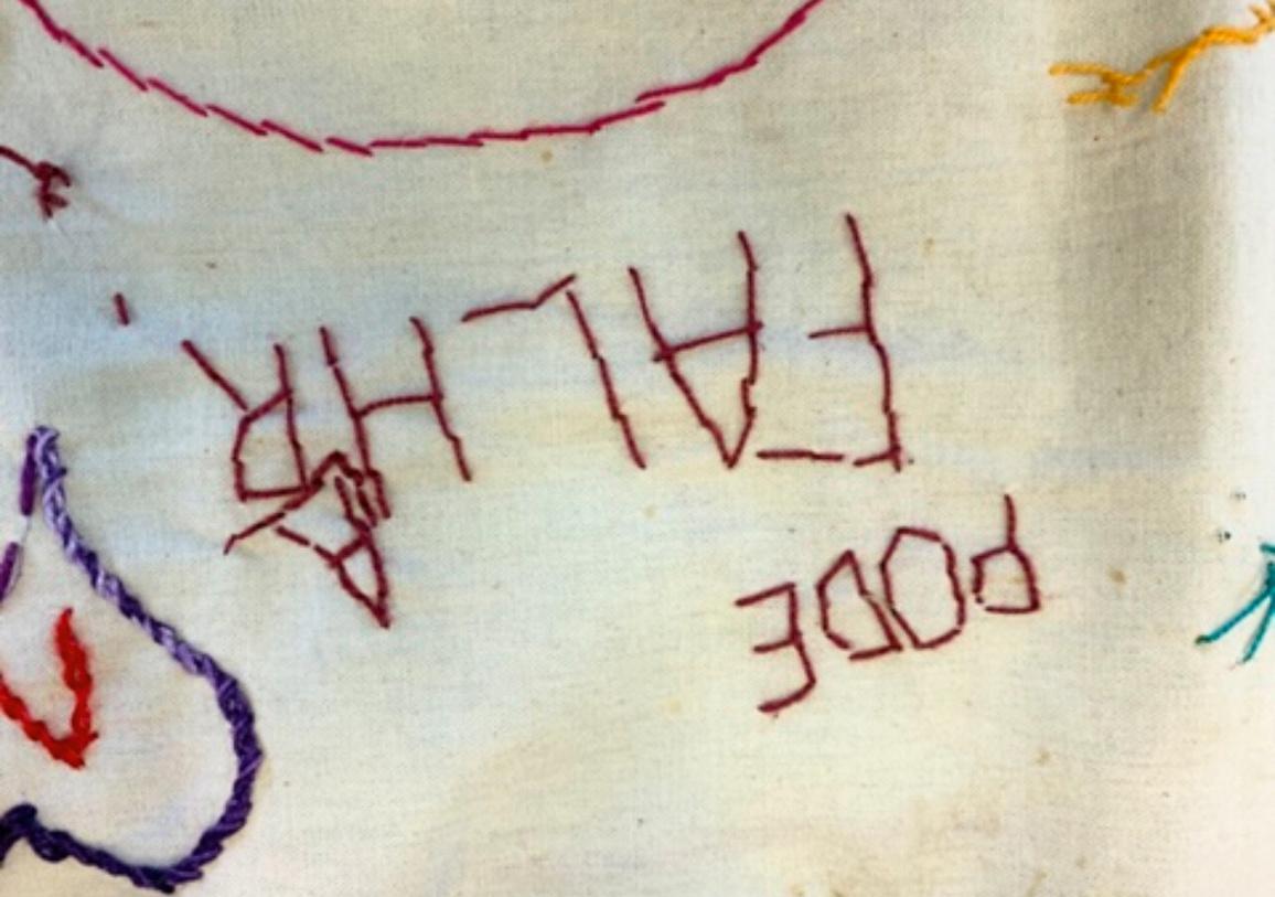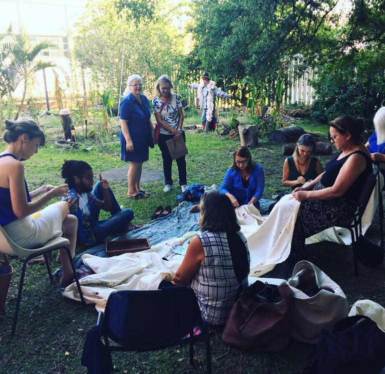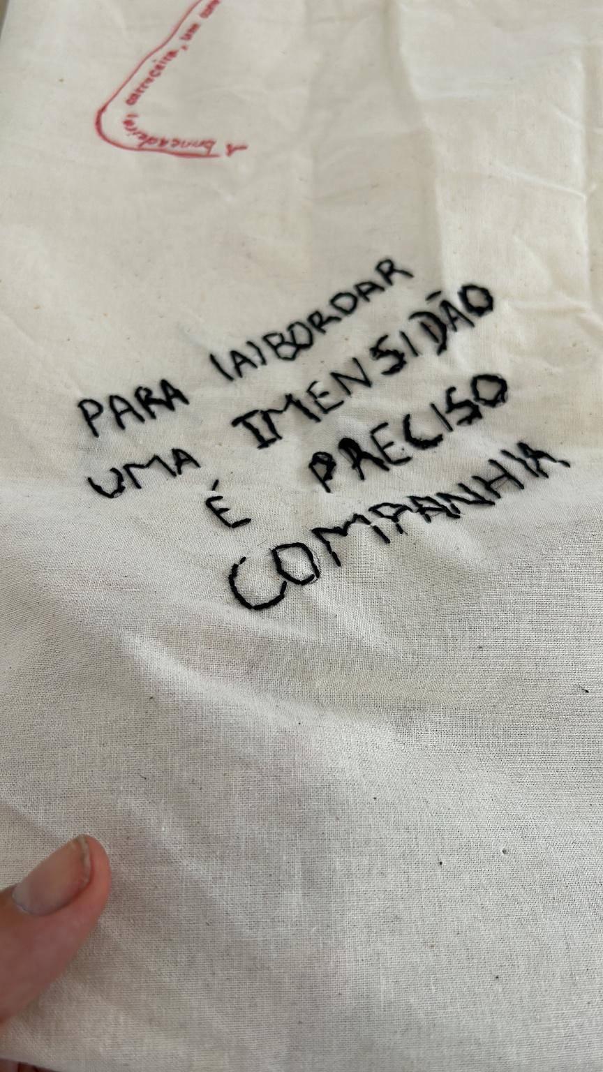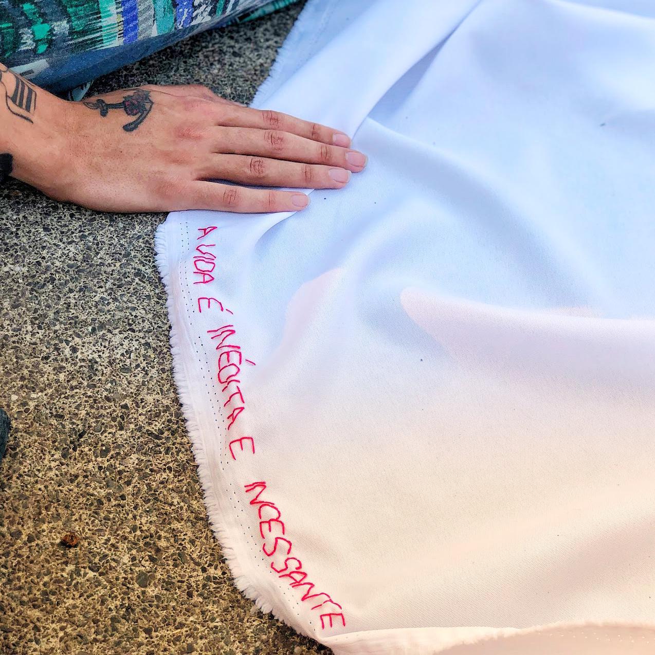 – No coração da agulha é um espaço de cultivo de relações de disponibilidade, confiança e empatia, onde nutrimos atitudes de respeito e acolhimento à diversidade de vozes e modos de existir que compõem o tecido social. No coração da agulha propõe o bordado como prática coletiva. A dimensão coletivizante deste trabalho se materializa nos grandes panos comuns que servem de suporte às rodas de bordado. Os panos bordados assim, livremente e à muitas mãos, atuam como superfícies de contato e inscrição de fragmentos de fala que reúnem conversas inacabadas, memórias, reflexões, perguntas, sonhos, desejos, angústias que nos conectam e representam, como corpo coletivo.